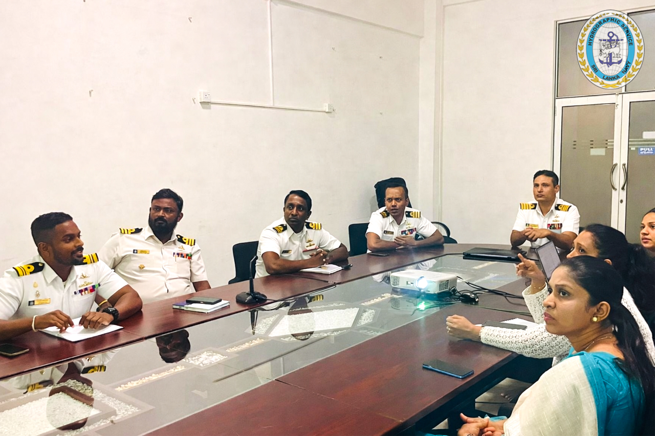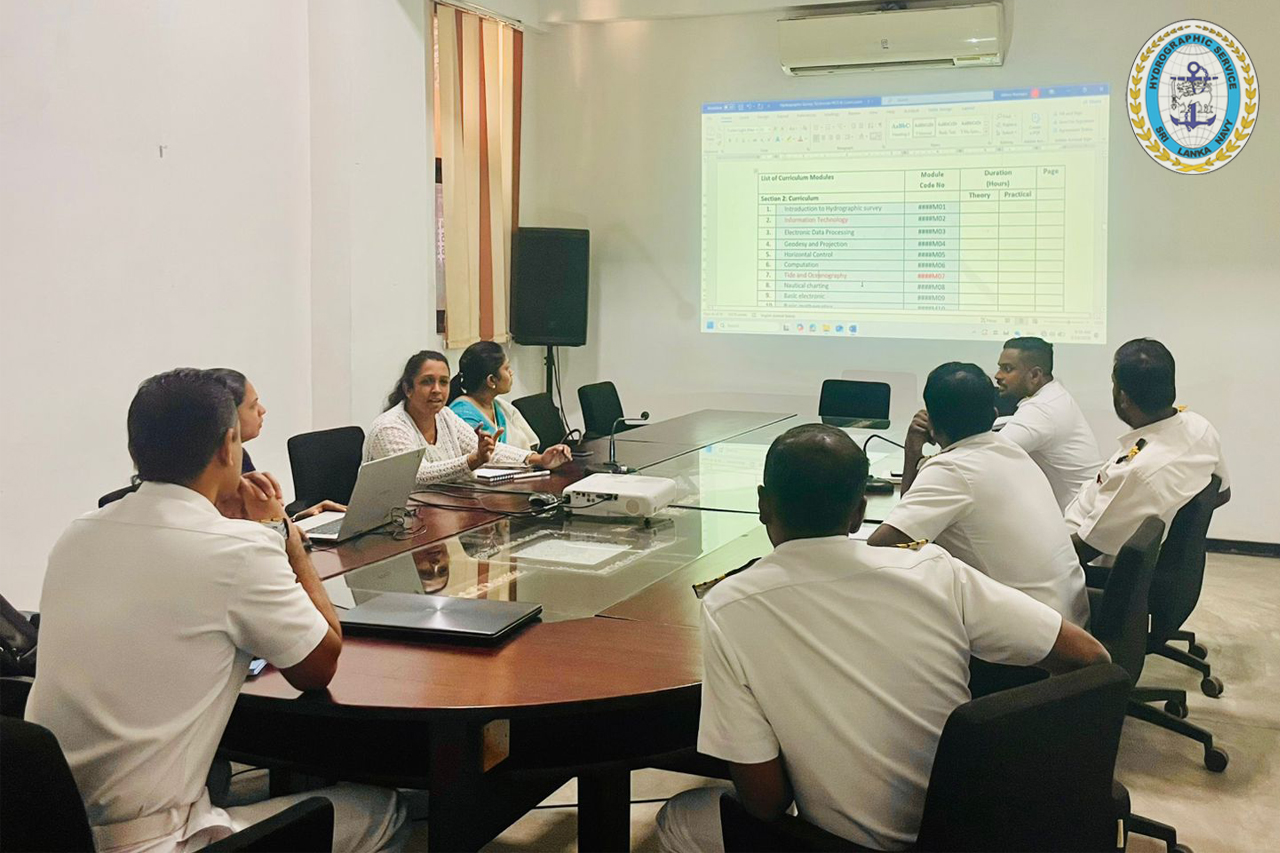 The main objective of this workshop was to finalize the required standards and curriculum framework to obtain NVQ Level IV for the Survey Recorder III Course conducted at the Naval and Maritime Academy, Trincomalee. Hydrography officers from SLNHS collaboratively participate in the workshop, contributing their professional knowledge under the guidance of the Chief Hydrographer to ensure that the standards meet national vocational qualification requirements.